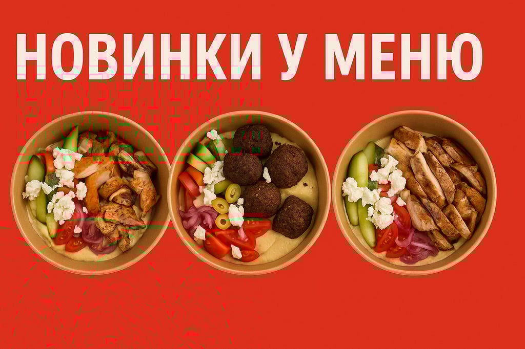 Склад: фалафель, хумус, салат айсберг, маринована цибуля, червоний перець, соус дзадзикі, грецька піта.