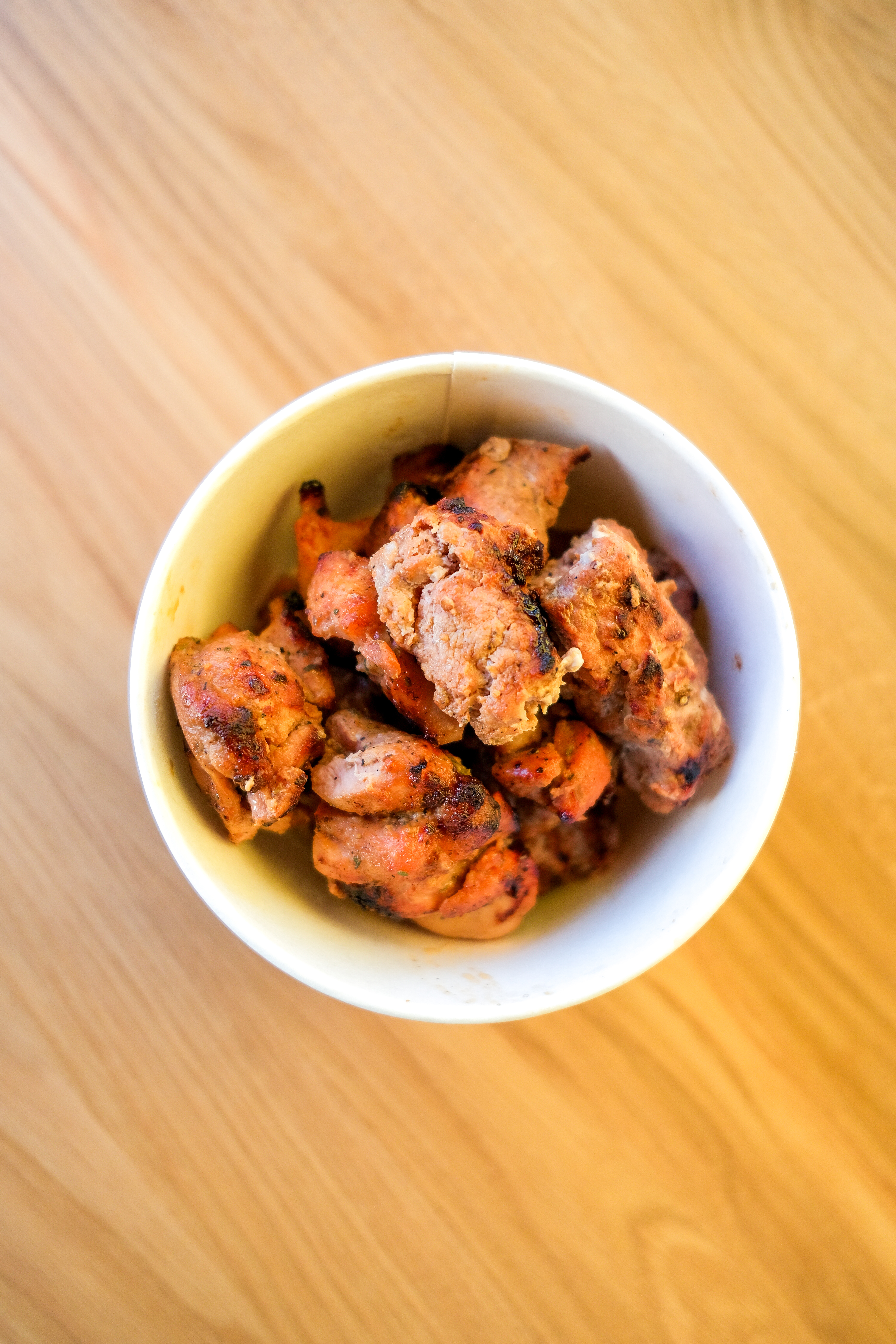 Склад: два шашлички з філе стегна (можливість додати більше м'яса), картопля фрі або по-селянськи, маринована цибуля, томати черрі, салат айсберг, соус дзадзикі.