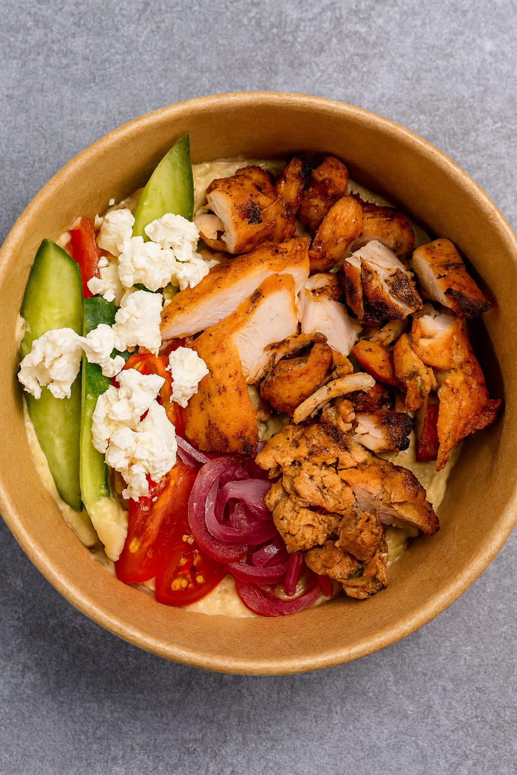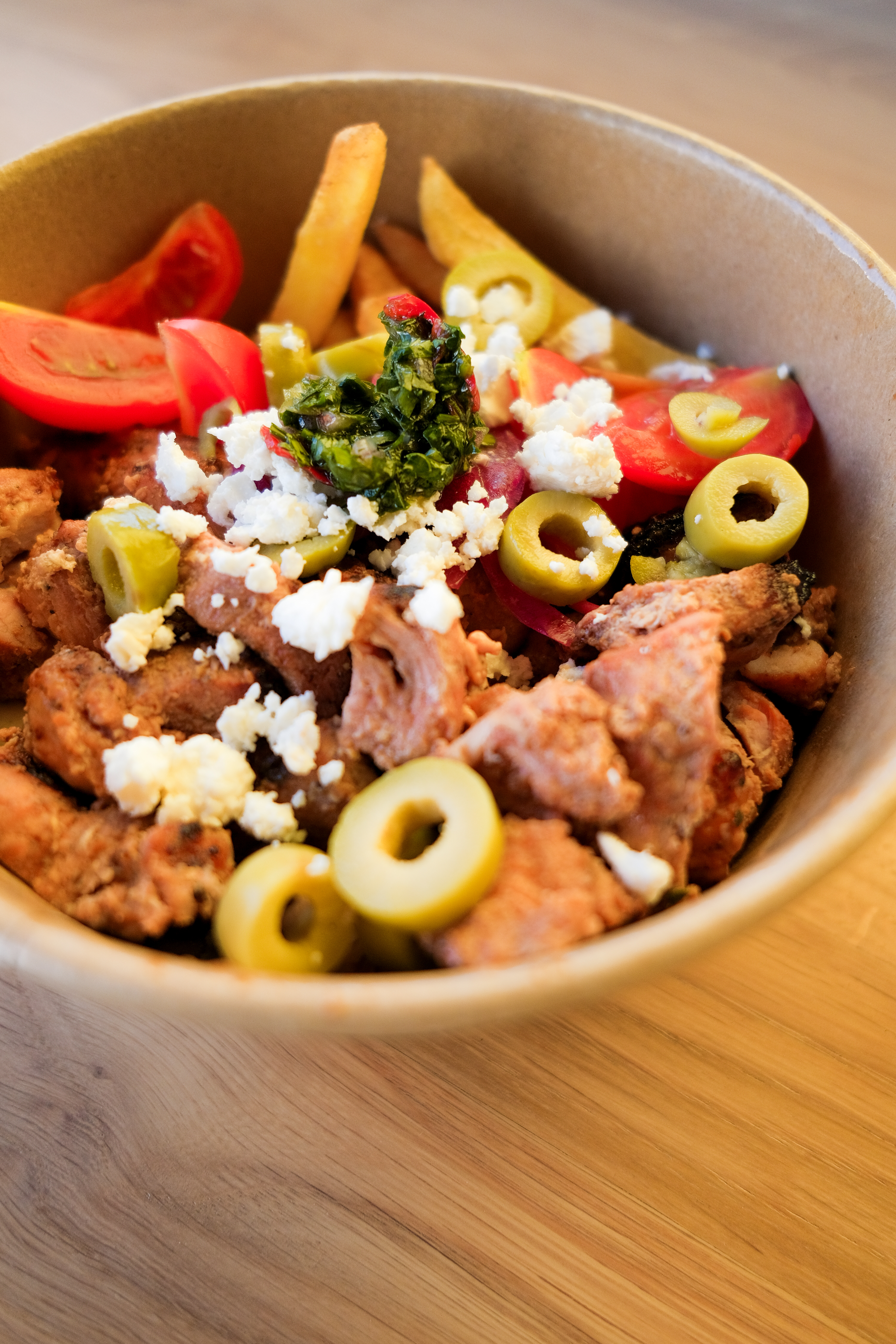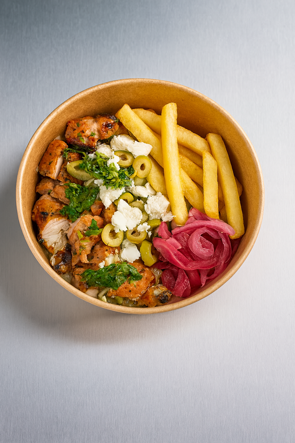 Склад: подвійна порція курки, маринована цибуля, томати, соус дзадзикі, картопля фрі, грецька піта.