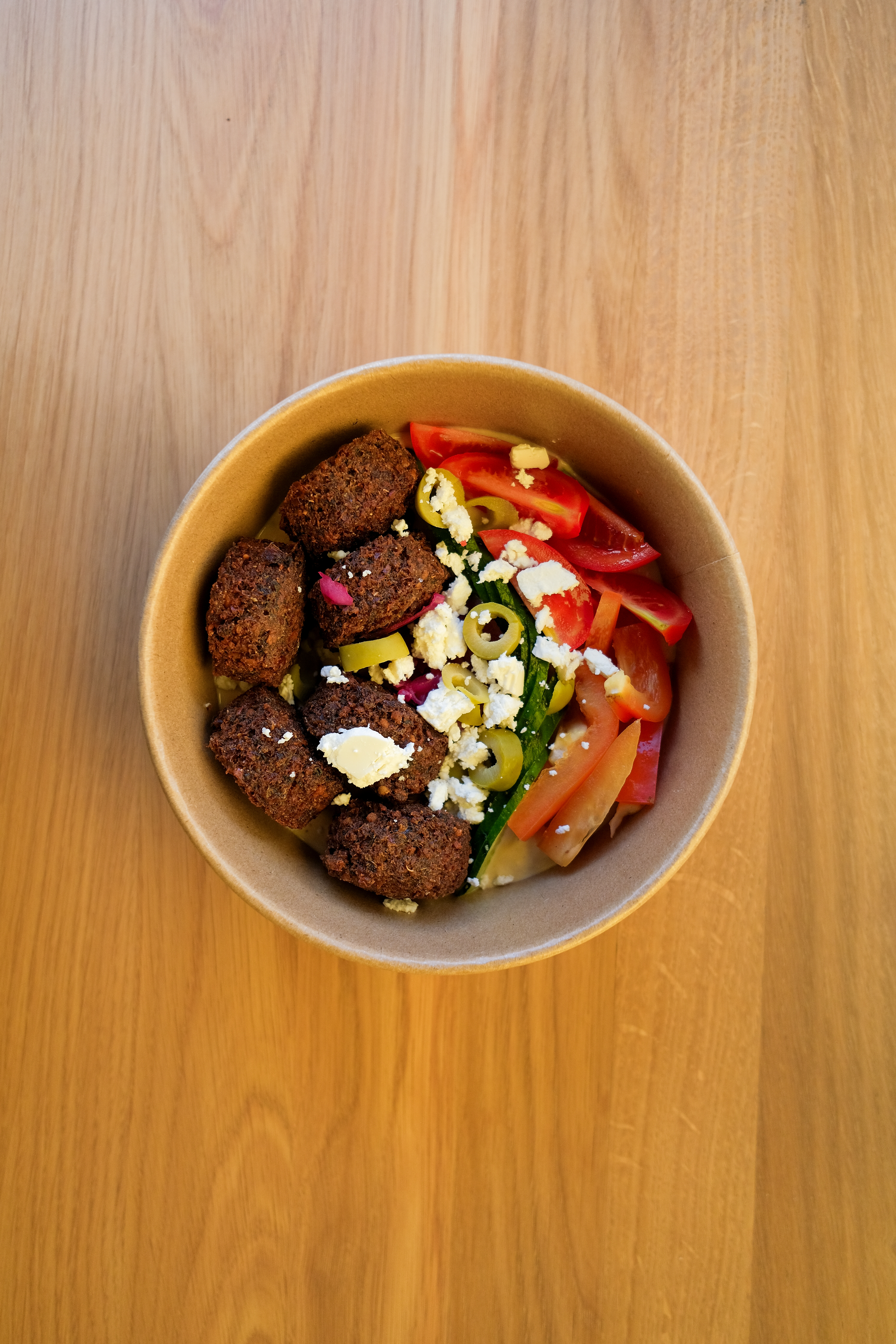 Склад: фалафель, хумус, помідори черрі, салат айсберг, піта.