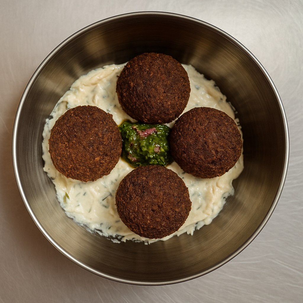 Склад: фалафель, хумус, салат айсберг, маринована цибуля, червоний перець, соус дзадзикі, грецька піта.